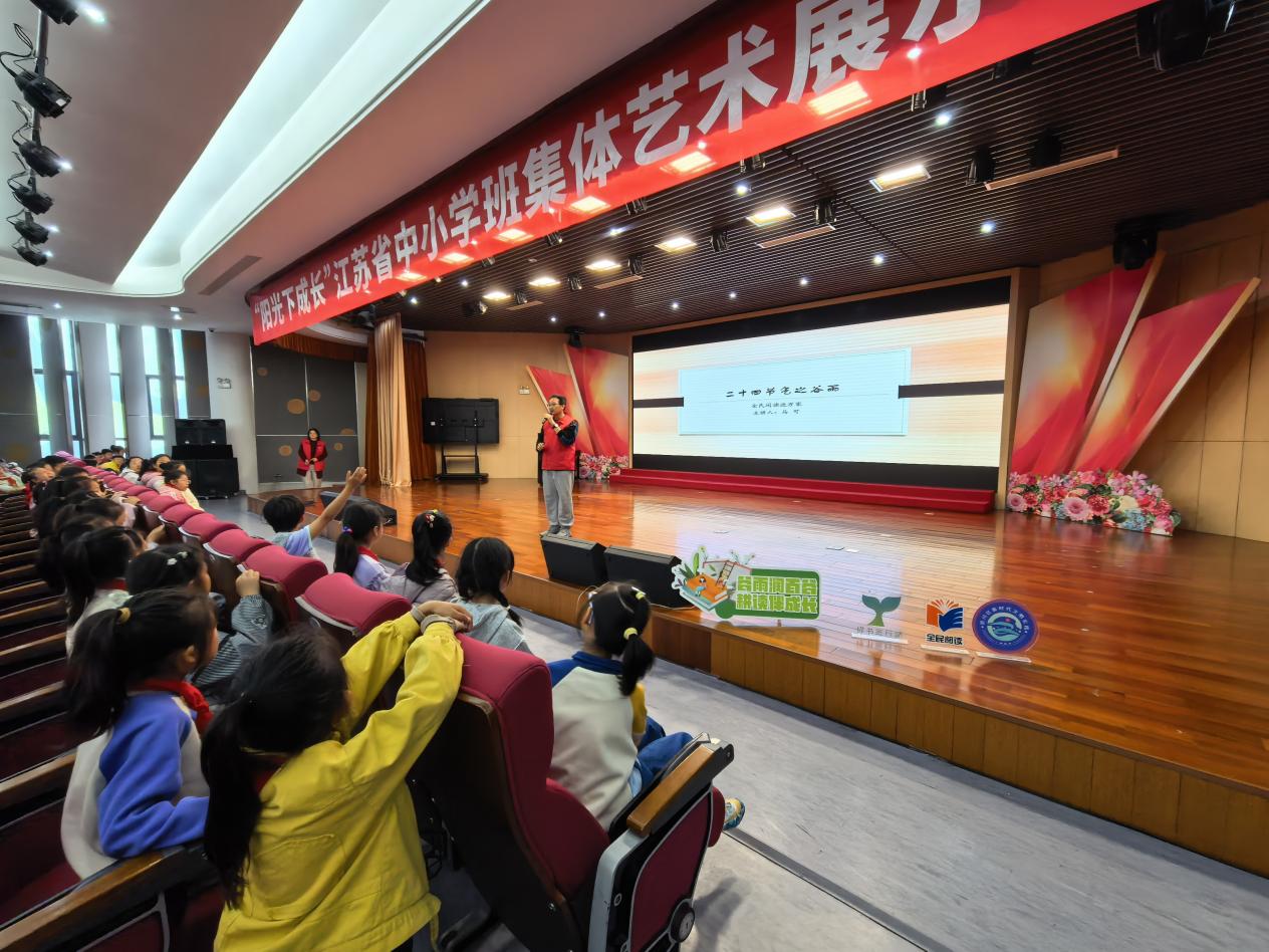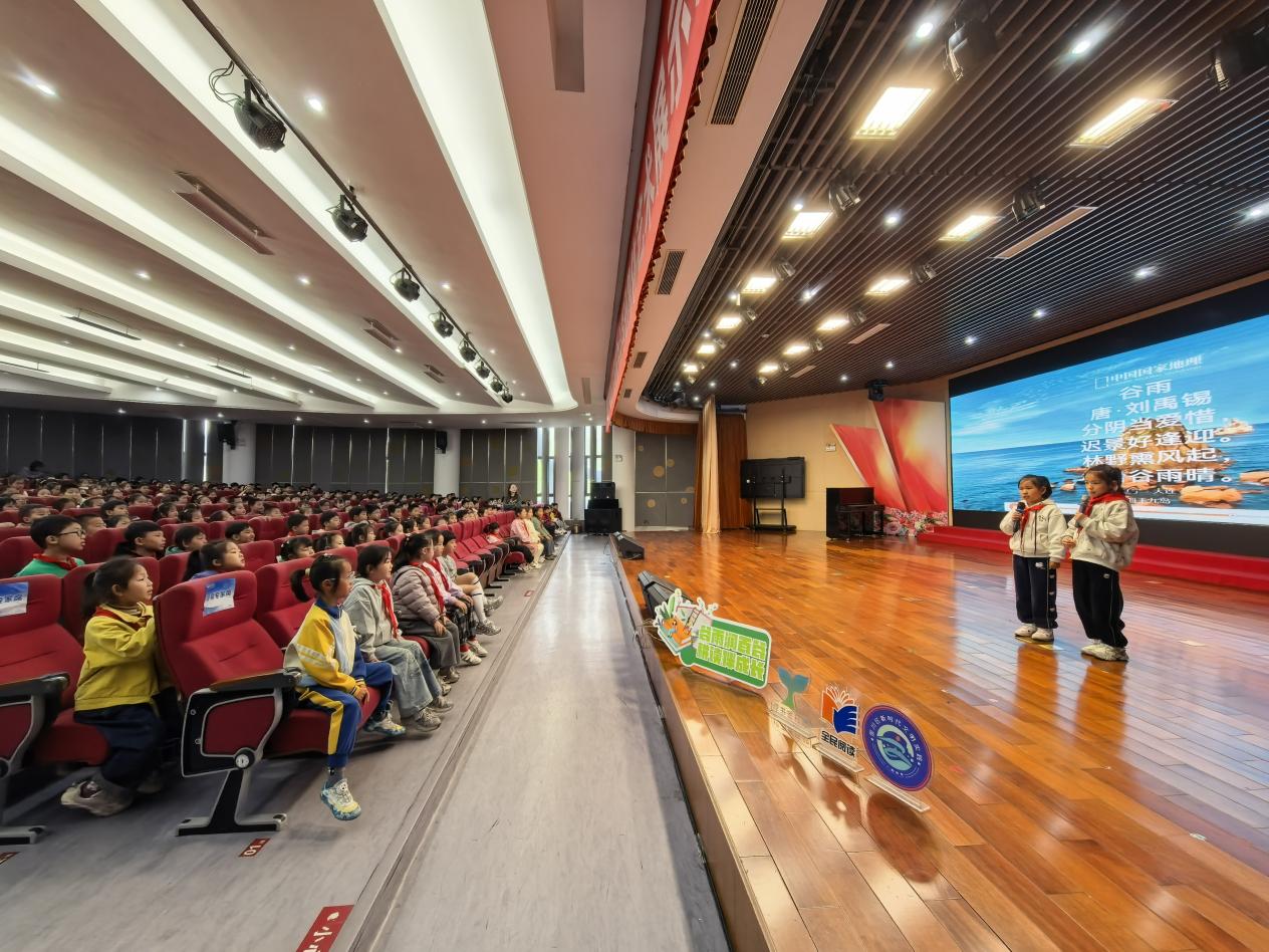 紧接着,报告厅的灯光微微调暗,舞台中央,两名来自崇川学校的学生代表精神抖擞地站定,手里捧着诗集,目光明亮。随着一声清脆而有力的领读:“谷雨春光晓,山川黛色青。”刹那间,台下全体学生齐声跟诵,清脆的童音在宽敞的报告厅里回荡,仿佛把春天的雨丝和田野的绿意都搬进了室内。领读的同学声情并茂,时而舒缓如细雨绵绵,时而明快如雨滴跳跃,把谷雨时节的万物生长、鸟鸣花香都融进了诗句里。短短几分钟的朗诵,没有复杂的配乐,也没有华丽的舞台效果,却因为孩子们那份纯粹的认真而格外动人。