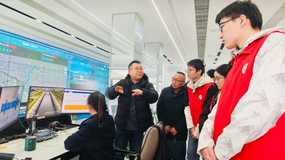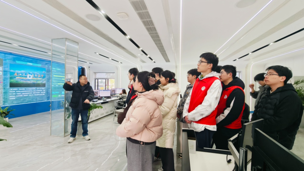 随后,众人来到船闸运调中心,眼前大型LED电子屏上实时呈现的全域船闸调度画面,让青年们倍感振奋。大家立足九圩港,通过智能调度系统,清晰地看到数公里外南通五所交通船闸的集中管控、远程操作全过程,切实感受现代水利科技的高效与智能。当南通理工学院用友学院的青年学子目睹清澈水流承载万吨船舶,借助水位落差精准调控、平稳过闸的震撼场景时,纷纷发出由衷赞叹,真切体会到水利工程的精妙与水资源调配的重要性。