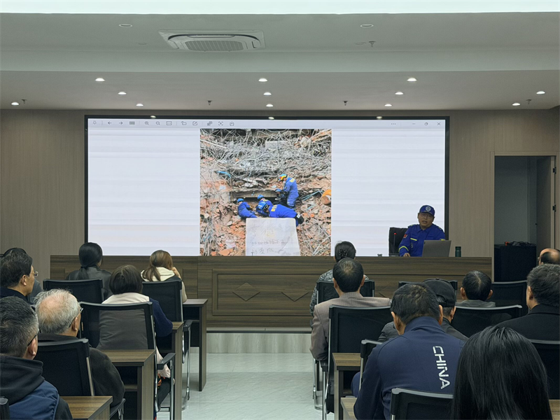 活动开场,南通蓝天救援队曹城瑞队长结合社区实际场景,进行了应急知识专题讲解。以地震突发场景为例,他详细介绍了“伏地、遮挡、手抓牢”的核心原则,以及室内躲避、室外疏散的关键流程。考虑到外卖小哥的职业特点,曹队还特别讲解了骑行安全和户外突发灾害避险知识,鼓励他们在送餐途中关注沿途安全隐患,当好社区安全“观察员”。