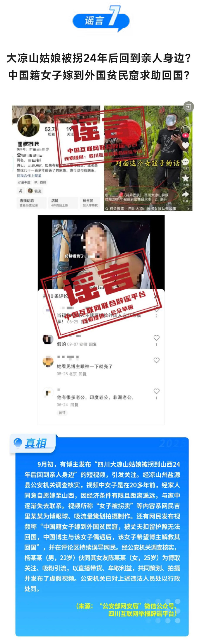 悲情故事类谣言也时有发生。有自媒体为博眼球、吸流量,策划拍摄“大凉山姑娘被拐24年后回到亲人身边”的视频。另有编造“中国籍女子嫁到外国贫民窟求助回国”剧情,用苦情戏码吸引网民、博取关注。这些行为欺骗网民感情,渲染负面情绪。
