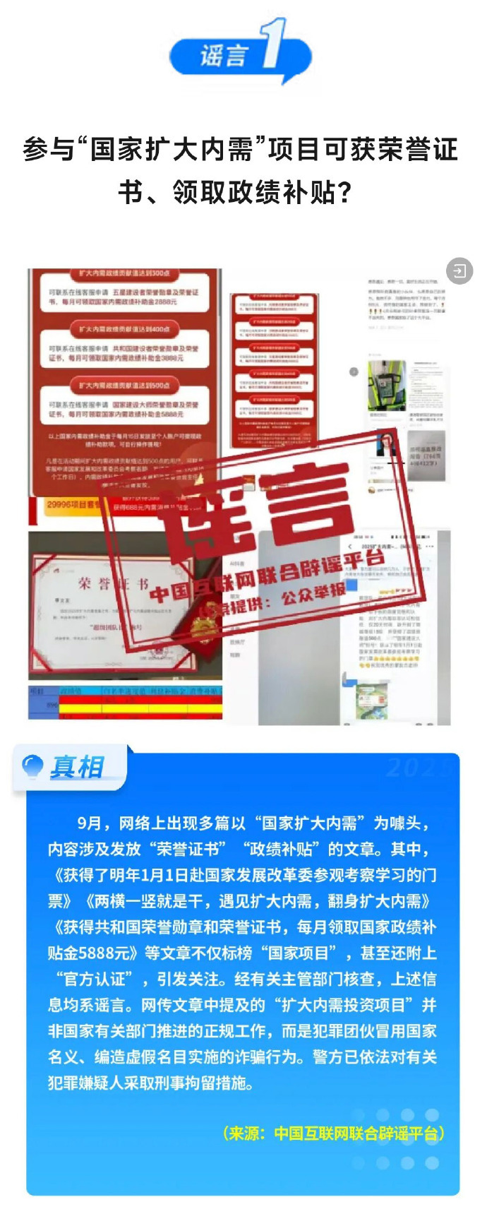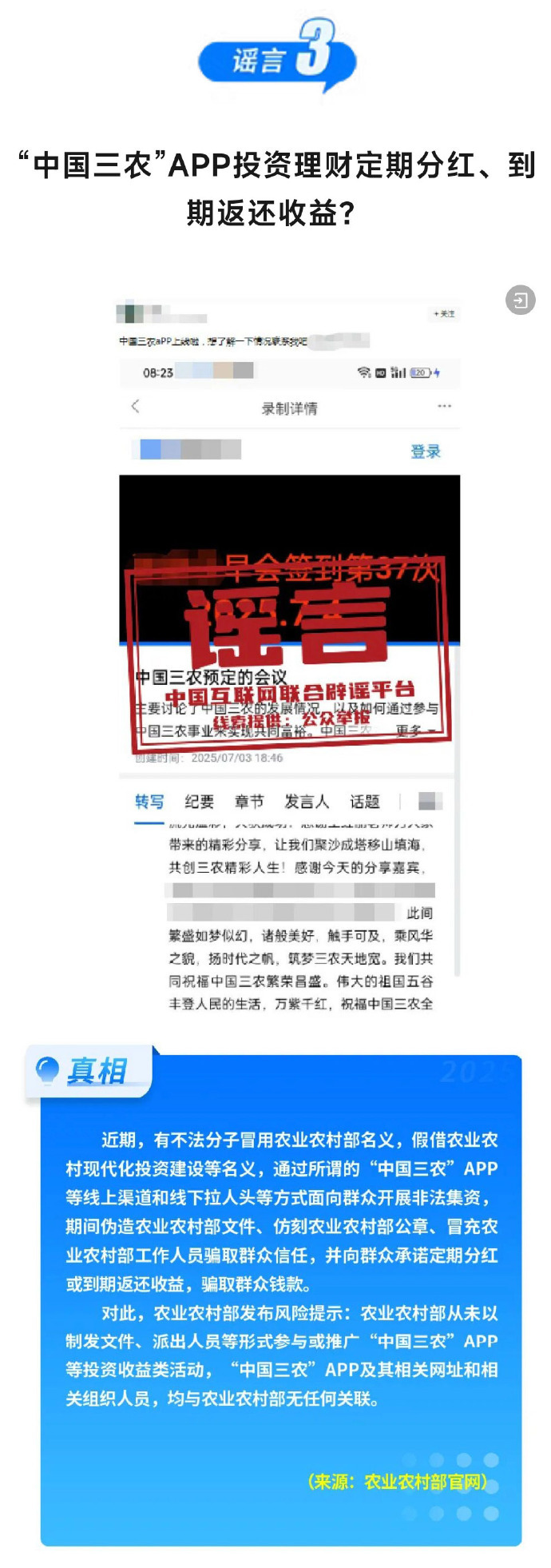 有不法分子编造“2025年国家薪资补贴申领认证通知”,以“国家补贴”为幌子,诱骗群众点击链接,套取实名信息实施诈骗。所谓“中国三农”投资理财APP,冒用农业农村部名义,伪造部委公文,以定期分红、到期返还收益为诱饵,开展非法集资活动。还有人以“扩大内需”“国家项目”为噱头,发布“参与国家项目获荣誉证书和政绩补贴”等不实信息,严重侵害群众财产安全。