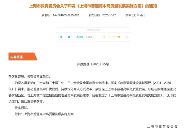上海市教育委员会发布《上海市普通高中高质量发展实施方案》(上海教育官网)