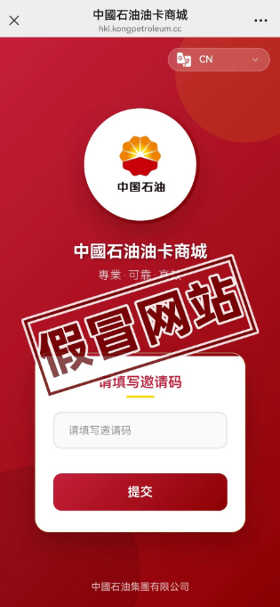 近日,有不法分子冒用中国石油官方名义,通过假冒网站(https://hkl.kongpetroleum.cc/home)售卖加油卡。对此,公司严正声明,该网站系假冒,非中国石油官方授权的加油卡销售平台,我公司已向有关监管部门举报查处。公司提醒广大消费者:请擦亮双眼,保持警惕,切勿轻信非官方渠道信息。