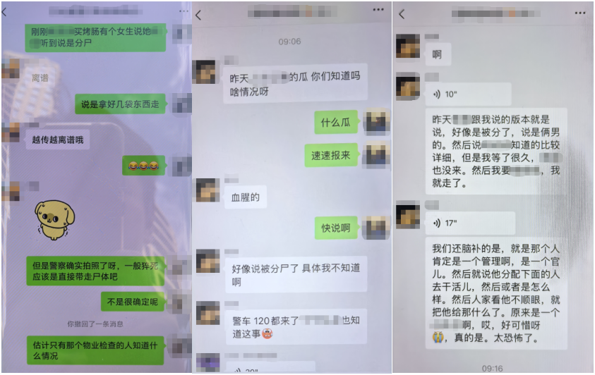 就在警方开展调查期间,有网民路过现场知晓死者信息,或臆断编造、或道听途说,将“杀人分尸”“凶手是‘官’” 等不实内容,发至本地微信群。短短2小时,该消息通过网络疯狂传播,细节越传越“真”:有人编造“凶手仍在城区流窜”,有人伪造“市公安局封锁现场视频”,甚至有人将自己的猜想大肆谈论“肯定是情杀”!