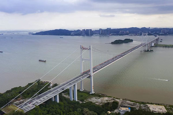 虎门大桥位于珠江口狮子洋上,连接广州市南沙区和东莞市虎门镇,全长约16公里,双向6车道。主桥长4.6公里,主跨为888米的钢箱梁悬索桥。