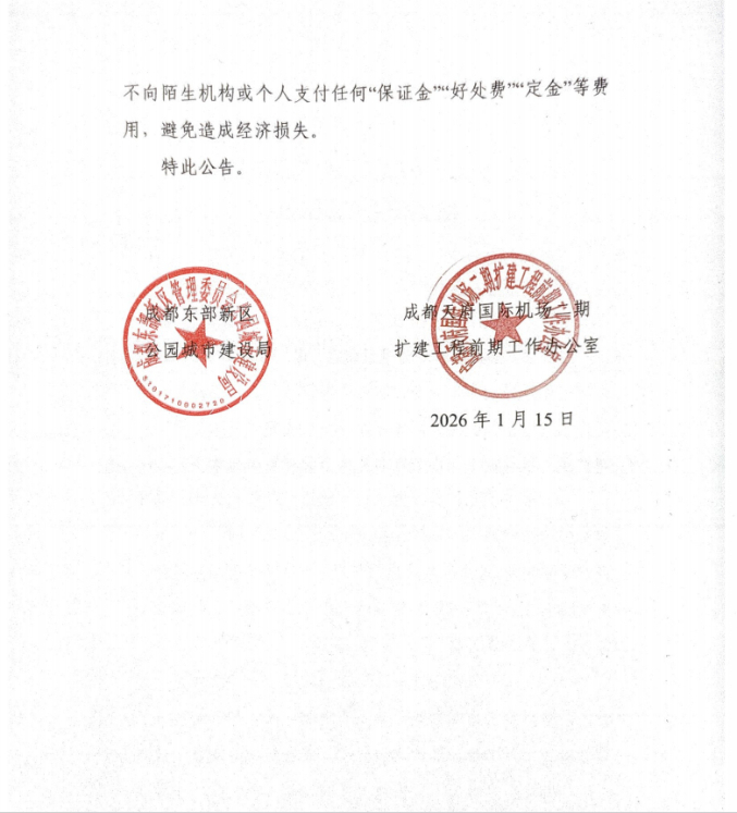 1月15日,成都东部新区公园城市建设局与成都天府国际机场二期扩建工程前期工作办公室联合发布《关于天府国际机场二期工程相关信息的公告》,其中提到,近期,个别人员在网上发布所谓天府国际机场二期工程招工信息,造成不良社会影响。经核实,相关内容均为虚假信息,请广大群众切勿轻信。