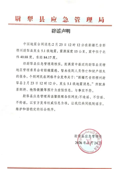 经尉犁县应急管理局核实,目前未造成人员伤亡和财产损失。网传“房屋倒塌”“抢险救援”等图片与实际情况不符。