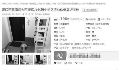 近期南京二手房网上挂出了一套仅有19平方米的力学小学学区房,标价198万元,划到单价10万元/平方米。 交汇点南京晨报记者 刘娟