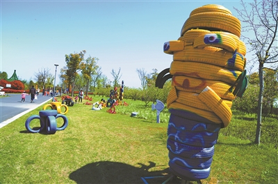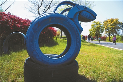 由2000只废旧轮胎创意加工制作成的卡通动漫人物、动物、汽车等各种造型,13日亮相太仓市浏河镇江滩湿地公园。 计海新摄 视觉江苏网供图