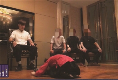 记者在照片中看到,女生穿着红衣黑裙跪在地上,弯腰磕头。在她的前方端坐着一名身着白色中式上衣的年轻男子,挺年轻,看上去也就20多岁。该男子左手边还有三名男子坐在椅子上,像是在见证整个仪式。