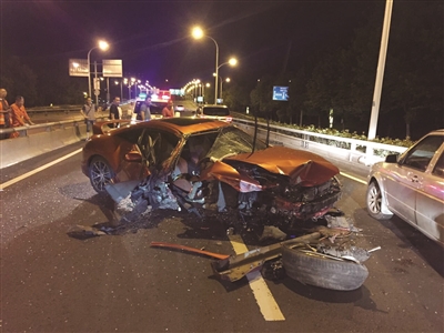 中国江苏网8月31日讯(记者 季宇轩)8月30日凌晨1点,南京市双桥门高架桥机场高速进入市区方向,在雨花台匝道口,一辆红色三菱轿车飞驰中,突然撞向高架桥边的护栏。