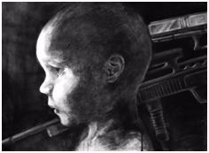 参展作品《生命》,作者是南外校友彭薇凌,“眼神深邃的儿童,一颗略显沉重的大头颅,黑色的背景隐藏着一支冲锋枪,生命显得那么的脆弱!”
