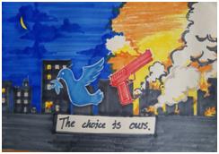 战争里,无论怎么逃,都难觅得一方宁静。一边是蓝色的梦乡,安宁美好;一边是战火连天……这是罗子润另一幅参展作品,叫《The choice is ours》。参观一圈,看到这些学生之作,都嵌入了自己“独立之思想”。曹老师告诉记者,参展选手,不少都是准00和00后。这是00后们眼里的“战争”及未来。都说“艺术源自生活”,00后们对艺术的感知感悟,又来自哪里?罗子润说,艺术应该是自由的,创造力存在于他每天所见、所观、所思,《The choice is ours》这幅作品灵感同样来自他喜欢的电影场景。自由创作,是他对艺术的理解:“创造力不是培训班能给的。”他小时候上过培训班,但“把绘画基础部分学完后,却不知该去画什么了,这令我有点不知所措。后来,我退了美术班。”他画自己感兴趣的东西,把自己对战争、对整个世界的理解,画到作品里。