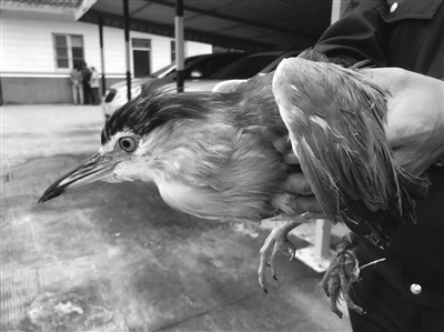 在派出所里,民警小心翼翼地将小家伙抱起,仔细查看它的伤势。这只鸟的喙部呈尖细状,体态较肥,颈较短。根据该鸟的特征,民警在网上查询得知,这个小家伙是夜鹭,属国家二级保护动物。