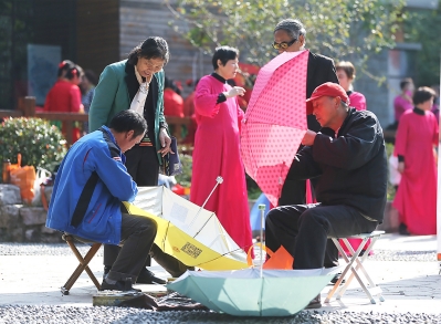 昨天,宁海路街道古林社区举办“幸福度重阳”主题活动,社区志愿者现场为老年人提供中医推拿、修伞等服务。本报通讯员朱岩本报记者 徐琦摄