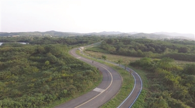 记者近日从江宁牛首山脚下的东周线驶入江宁西部生态环线,只见崭新的沥青道路就像是一条丝带飘飞在山水花草间,放眼望去,绿草萋萋,远山如黛,村落、水库、山坡、河塘等散落沿线。