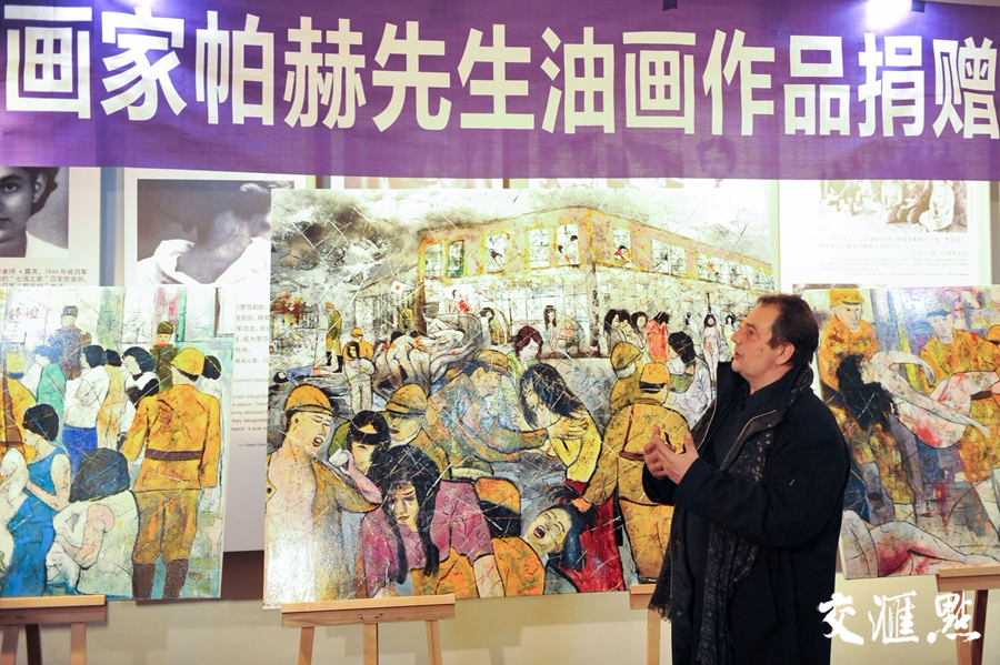 继去年将南京大屠杀题材巨幅油画《暴行》捐赠给侵华日军南京大屠杀遇难同胞纪念馆后,12月12日上午,法国著名画家克里斯蒂安·帕赫又将他绘制的“慰安妇”题材油画捐赠给南京利济巷慰安所旧址陈列馆。帕赫捐赠的5幅油画,分别是他前不久在法国创作的大型油画《南京痛苦的嘶吼》,以及今年九、十月间到访南京时,创作的油画《地狱的眼睛》、《说“不”的女人》、《体检》,以及《南京,为和平而努力》。