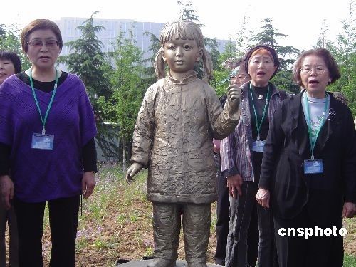 2009年4月18日,前来参加铜像揭幕仪式的日本紫金草访华团一行20多人在铜像旁唱起“和平之歌”。图中左二为大门高子。
