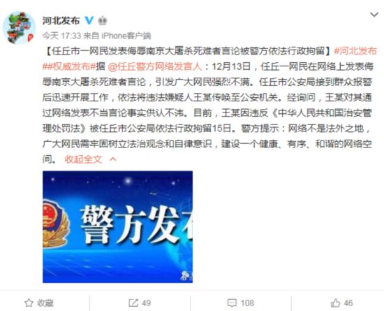 人民网北京12月14日电 河北省任丘市公安局今天通过微博通报,任丘市一网民发表侮辱南京大屠杀死难者言论被警方依法行政拘留15日。