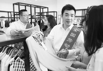 昨天,全国劳模上海第一百货商店首席技师李惠麟、上海第一八佰伴专柜营业员郭强等,来到我市汤山一家大型购物城,共同进店化身时尚导购,引导顾客如何合理挑选商品。 本报记者 吴彬摄