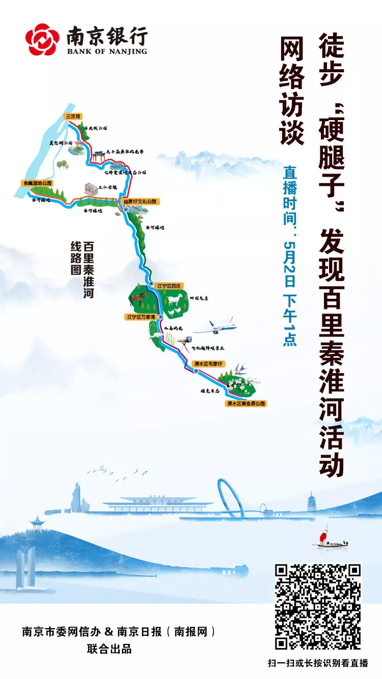 不久前,一群特殊的“硬腿子”们用徒步与骑行的方式,实地探寻了南京人的“母亲河”——百里秦淮河全线。就在今天,这群“硬腿子”们走进直播间,与网友们零距离接触,分享实地探寻秦淮河沿岸的诸多精彩见闻,并告诉大家,全长约110公里的秦淮河,绝不止是“十里秦淮,桨声灯影”那么简单。