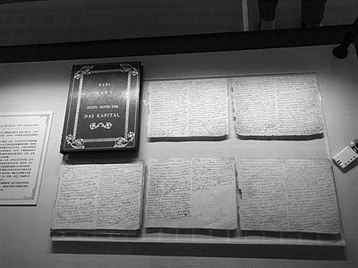 据了解,该手稿为《布鲁塞尔笔记》中的第四本笔记本,原有30张纸60页,此次展出的有27张纸54页,其中49页写有字迹。手稿主体部分写作于马克思历史唯物主义思想形成的1845年,主要摘录了斯托奇、平托、柴尔德等经济学家的著作。记者在展览现场看到,展柜中的手稿纸张虽已泛黄,但是马克思的笔迹依然清晰,文中多处勾画着横线,显示出马克思的关注和思考重点。
