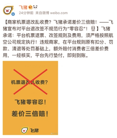 对此,阿里巴巴旗下的旅行平台飞猪,昨日在官方微博表示,一切以用户为本,以保障用户利益为第一,以“零容忍”力保消费者权益,规定平台上机票代理销售商家如未严格按照航空公司标准明示、收取退改费用,必须就差价的三倍赔偿消费者,且飞猪平台接到投诉后一经核实,予以先行赔付。