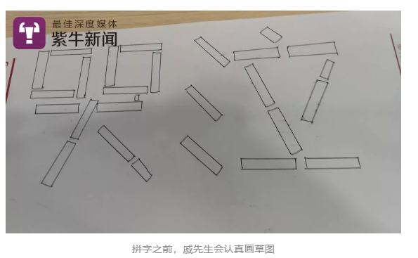 戚先生告诉扬子晚报紫牛新闻记者,他每次拼图之前,都要先画出草图,用尺子丈量,稍有偏差,自己就可能被圈在里面出不来。比较基本的简单的字需要拼四个小时,复杂点的,比如“闷”,要用六个小时才能完成。而“闲置”二字他用了整整一天,全程都是自己驾驶的,没有让任何人帮忙。