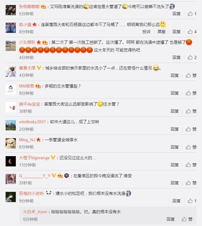 爆管段止水后,城东部分地区应该已经有水了,大家看看家里有无水,有水的可以继续洗漱了,没水的请耐心等待,我们已在全力抢修。第二天上班的小伙伴们明天早上出门注意确保家里的水龙头处于关闭状态,防止复水时家里被淹!