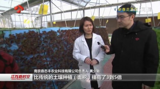 南京鼎态丰农业科技有限公司负责人黄少敏:它是全面立体的,比传统的土壤种植面积提高了3到5倍,它每年终年的轮作次数是4到6次,它的产量是比传统的种植方式产量提高3到5倍,而且是零化肥这种状态去种植。