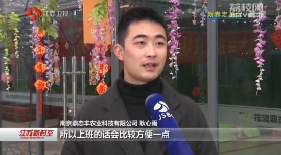 南京鼎态丰农业科技有限公司耿心雨:基地就在家门口,对我来说很方便,而且在这里干,感到特别有意思也特别充实,每天能接触到各色各样的游客,在黄博士那里也能学到不少农业科技知识,很有干劲,在这里发展,我觉得很有奔头。