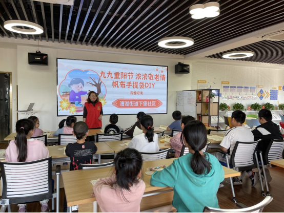 在重阳节来临之际,苏州市相城区漕湖街道下堡社区组织开展“我们的节日•重阳——九九重阳节,浓浓敬老情"帆布手提袋DIY活动。活动吸引了众多孩子们的参与,他们积极展示自我创造力和手工艺术才能,承接着敬老精神的传承。