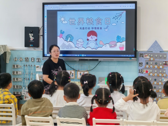 了解粮食知识,增强节粮意识。为丰富孩子们关于粮食的知识,隽溪幼儿园各班老师积极开展主题教学活动。老师们利用课件、图片等向孩子们介绍世界粮食日的由来和意义;通过生动、形象的绘本故事,帮助孩子们更好地理解有关粮食的概念,让他们知道粮食是生命之源,也是能量之源,它和水、空气一样,对人类的生存起着重要的作用;通过播放视频让孩子们观看“杂交水稻之父”袁隆平爷爷的感人故事,了解当代“神农”袁爷爷为中国水稻研究事业所付出的艰辛努力及所作的巨大贡献,感受白花花大米饭的来之不易,进而增强孩子们爱惜粮食、节约粮食的意识。