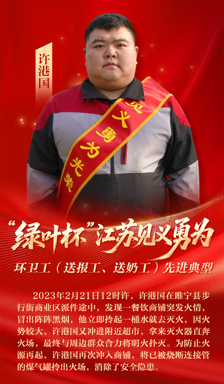 编者按:在平凡日常中,总有一些人于危急时刻挺身而出,以无畏之姿书写不凡篇章,用生命与热血铸就正义丰碑。为大力弘扬见义勇为精神,营造见贤思齐、崇德向善的良好社会氛围,江苏省见义勇为基金会联合苏州绿叶科技集团,共同推出“‘绿叶杯’江苏见义勇为先进典型”系列宣传。聚焦近年来江苏见义勇为环卫工(含保洁员、物管员)、送报工(含投递工、快递员)、送奶工的先进典型,他们平平凡凡却能在关键时刻闪耀光芒,普普通通却以无私无畏铸就伟大。他们在人民群众生命财产安全遇到危险或受到侵害时,毫不犹豫挺身而出,用智慧、力量、勇气和善心铸就壮举。我们以文字为笔,记录这些英雄故事,让“德者有得、勇者有荣、义者有誉、助人有福”的价值导向厚植社会、深入民心。