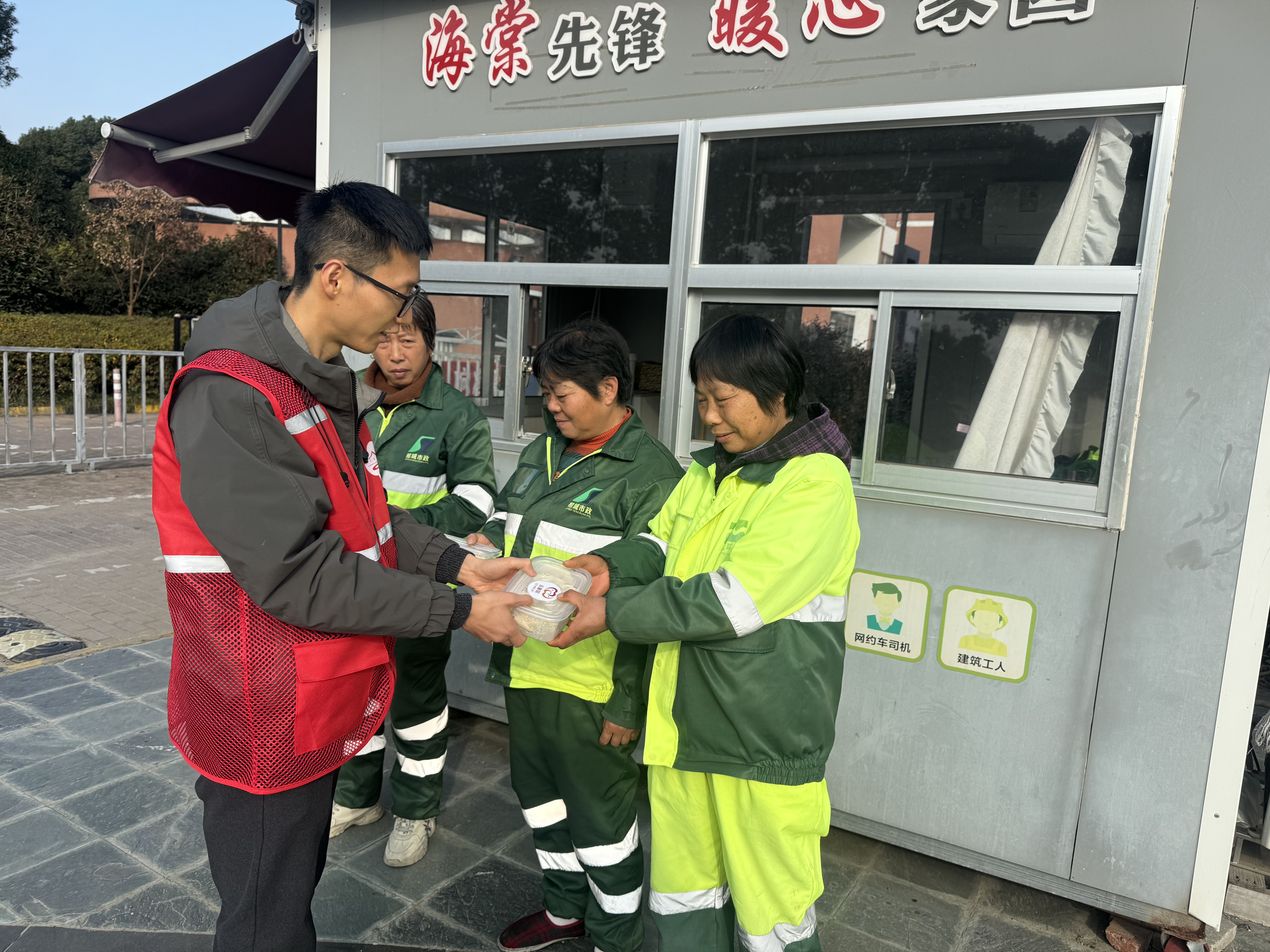 送完外卖骑手,工作人员又带着保温桶走向社区周边的“海棠巴士”,将热饺子送到正在休息的环卫工人手中。“阿姨们,冬至安康!辛苦你们了,快来吃口热乎的!”环卫工刘阿姨接过饺子,眼眶微微湿润:“天这么冷,还能吃到社区送的热饺子,太暖心了!”简单的问候、温热的饺子,让寒风中的劳动者们切实感受到社区的关爱。