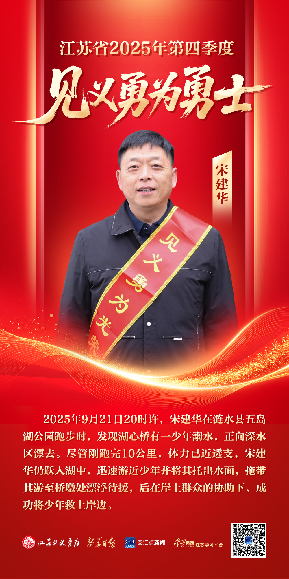 其事迹传开后,社会各界纷纷致敬。2025年10月,涟水县公安局确认其见义勇为行为;同年12月他获评第四季度“江苏见义勇为勇士”。平凡身躯蕴藏不凡力量,宋建华用义无反顾地纵身一跃,诠释了见义勇为的时代内涵,彰显了普通人的责任担当,激励着更多人传递真善美,让义勇美德在社会中代代传承。