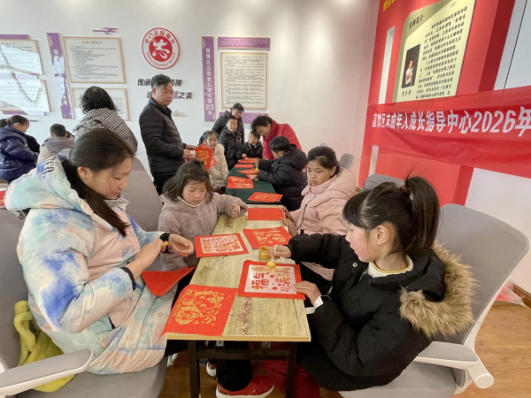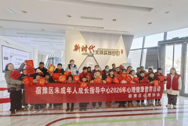 中国江苏网2月13日宿迁讯 一支毛笔拴四根绳,四个娃各拉一根——这福字还能写好吗?2月12日上午,一场别开生面的“迎新年,福气圈圈乐”主题体验活动在宿豫区新时代文明实践中心火热开展。活动摒弃传统个人书写模式,独创“四绳协力写福字”环节,宿豫区心理协会志愿者老师让孩子们在拉扯磨合中感受协作之难、在反复试错中习得坚持之力,将抗挫力训练悄然融进笔墨书香。
