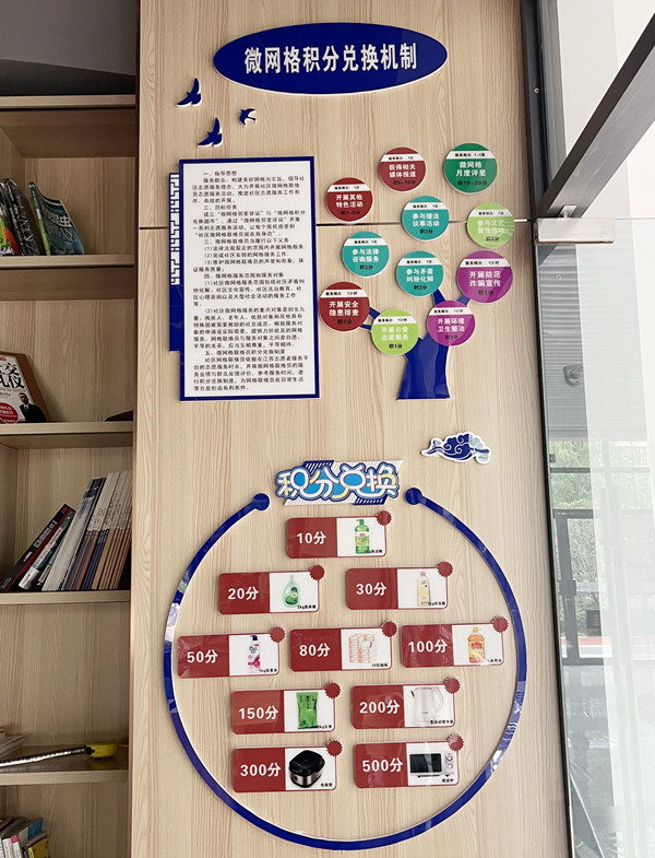 京东社区在未来城党支部一楼打造了润景苑微网格红色驿站,并配有微网格积分兑换超市,完善了微网格联络员积分管理制度,激励微网格联络员开展相关网格工作、志愿服务。