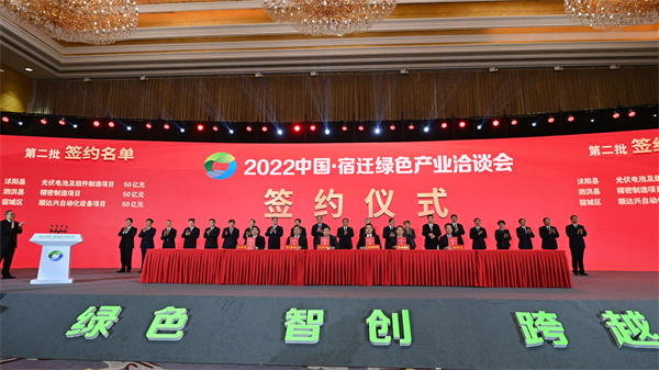 中国江苏网11月18日宿迁讯 项王故里,高朋满座;中国酒都,群贤毕至。11月18日上午,宿迁举行2022中国·宿迁绿色产业洽谈会开幕式暨投资环境说明会,本次大会主题为“绿色·智创·跨越”,旨在搭建沟通交流的桥梁、深化合作的平台、共谋发展的载体,与各位嘉宾共话合作、共享机遇、共创未来。本次开幕式采取视频连线方式举行,在宿迁设立主会场,市各驻外专业招商局邀请的嘉宾、客商,分别在当地分会场参会。来自全国各地的近400名客商代表出席本次活动。会上,共签约项目77个,协议总投资1087亿元。