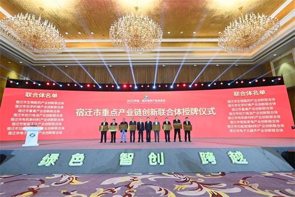 会上,中国纺织工业联合会授予宿迁“中国纺织产业基地市”称号,并举行揭牌仪式,授予沭阳县“中国纺织服装名城”称号,还举行宿迁市重点产业链创新联合体授牌仪式。(图/杨群 陈少帅 柏志勇)