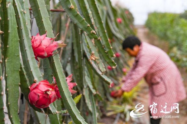 12月7日,在宿城区耿车镇红卫村的一处火龙果种植基地里,一个个鲜红欲滴的火龙果悬挂在绿色藤蔓上,果香四溢,十分诱人。工人穿梭在火龙果树间,忙着剪枝、采摘、装箱,为电话订购的客户准备好新鲜采摘的火龙果。