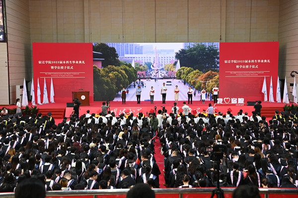 毕业典礼暨学位授予仪式以“圆梦宿院”为主题,在庄严的国歌声中拉开帷幕,全体出席人员起立,共同奏唱国歌;由大四毕业生带来的歌曲联唱《凤凰花开的路口》《青春纪念册》等曲调悠扬,燃爆全场。