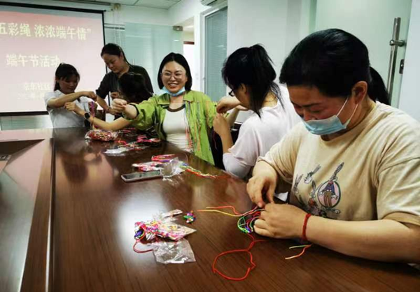 此外,京东社区还组织开展了“巧编五彩绳”手工活动。活动中,工作人员讲解了编织五彩绳的由来,演示五彩绳的编法,大家迫不及待地编织起来,现场气氛热烈,大家互相交流,一个个精致、五颜六色的手绳成功完成。