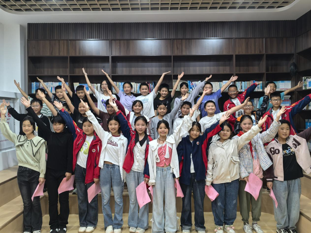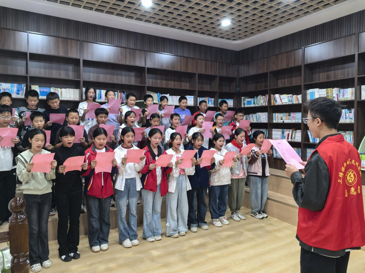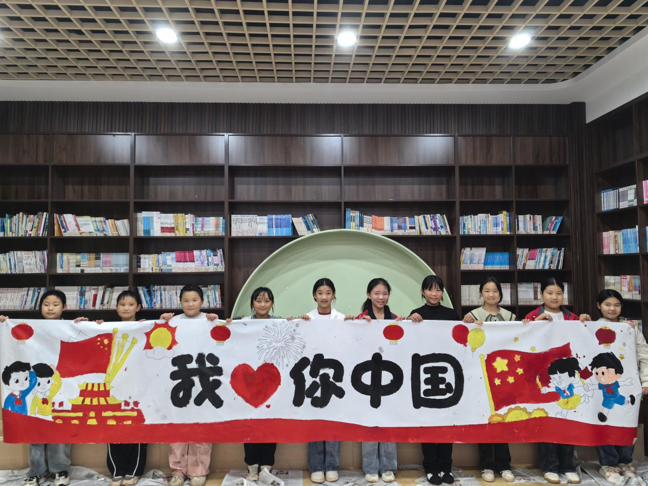 在诗词诵读环节,孩子们稚嫩却饱含深情的声音响起,他们回忆、朗诵着关于中秋、国庆的诗歌,那些经典的文字在童声的演绎下,既有对团圆佳节的憧憬,又有对祖国山河的赞美。“我爱我的祖国,爱她那奔腾的黄河、长江;我爱我的祖国,爱她那俊美的山河......”当全场齐诵《我爱祖国》时,朗朗童声汇聚成一股炽热的爱国暖流,在图书室里久久回荡,每一个词句都凝聚着孩子们对祖国最纯粹的赤子之心。