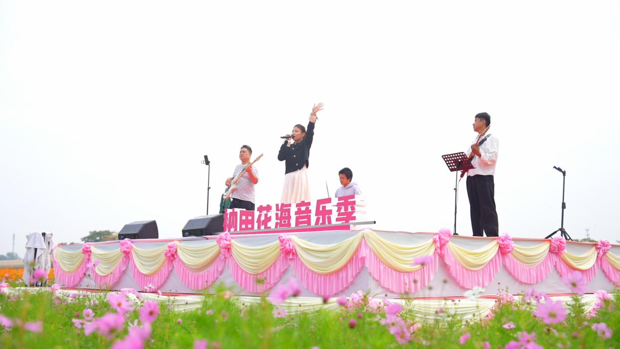 衲田花海作为景区“颜值担当”,在今年国庆期间焕发出别样魅力。花海中央,蛋糕造型舞台格外吸睛,粉白“奶油”纹路与波斯菊、硫华菊相映成趣,宿迁本地知名乐队登台,舒缓的民谣、动感的流行曲伴着花香飘散,吸引游客驻足聆听。“在花海中听歌,连风都带着花香,太治愈了!”来自徐州的游客小姐姐带着父母打卡,一边拍照一边感慨。