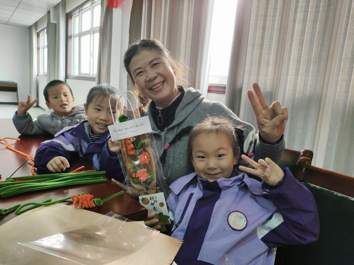 不一会儿,一束束金灿灿、毛茸茸的“事事如意”手捧花便在大家的共同努力下诞生。孩子们捧着亲手制作的花束,送到老人手中,甜甜地说道:“祝您像花儿一样永远漂亮,事事都顺心!”老人们接过花束,紧紧抱在胸前,拉着孩子们合影留念,镜头里定格下一张张幸福的笑脸。