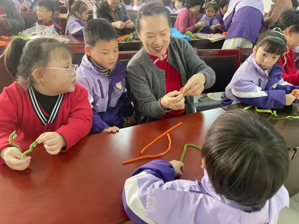 文艺表演后,最受期待的手工互动环节温情开启。孩子们与老人们围坐成圈,桌上整齐摆放着绿色、橙色的绒花扭扭棒、皱纹纸和红色丝带,一场以“事事如意”为主题的手捧花制作活动就此展开。老人们耐心十足,手把手教孩子们如何弯曲、缠绕扭扭棒,制作出圆润饱满的“柿子”造型,再小心翼翼地搭配绿色叶片点缀;孩子们则认真学习,时不时举起自己的“作品”向老人请教。
