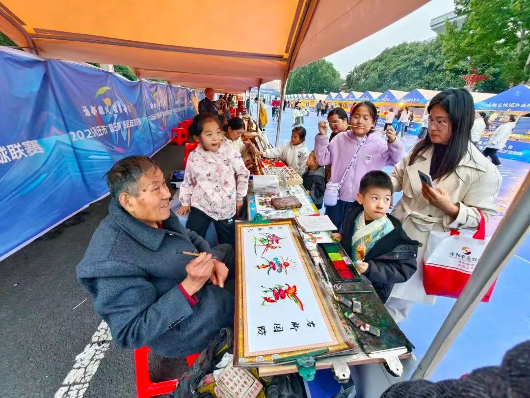沭阳主场赛事吸引1.2万名观众入场,刷新宿超上座纪录。沭阳文旅等部门在体育运动中心的赛场外推出“宿超市集”,设置了60个摊位,涵盖非遗展示、地道美食、亲子互动等业态,形成“观赛-消费-体验”的闭环。78岁非遗代表性传承人林云飞现场创作“花鸟字”为球队助威,其作品融入“沭阳队加油”元素,既传播文化又带动非遗衍生品销售;逆境优存作坊的酱渍辣椒借助赛事人气,开摊两小时售出100多瓶辣椒酱产品,负责人李敬娣直言“真是意想不到”。