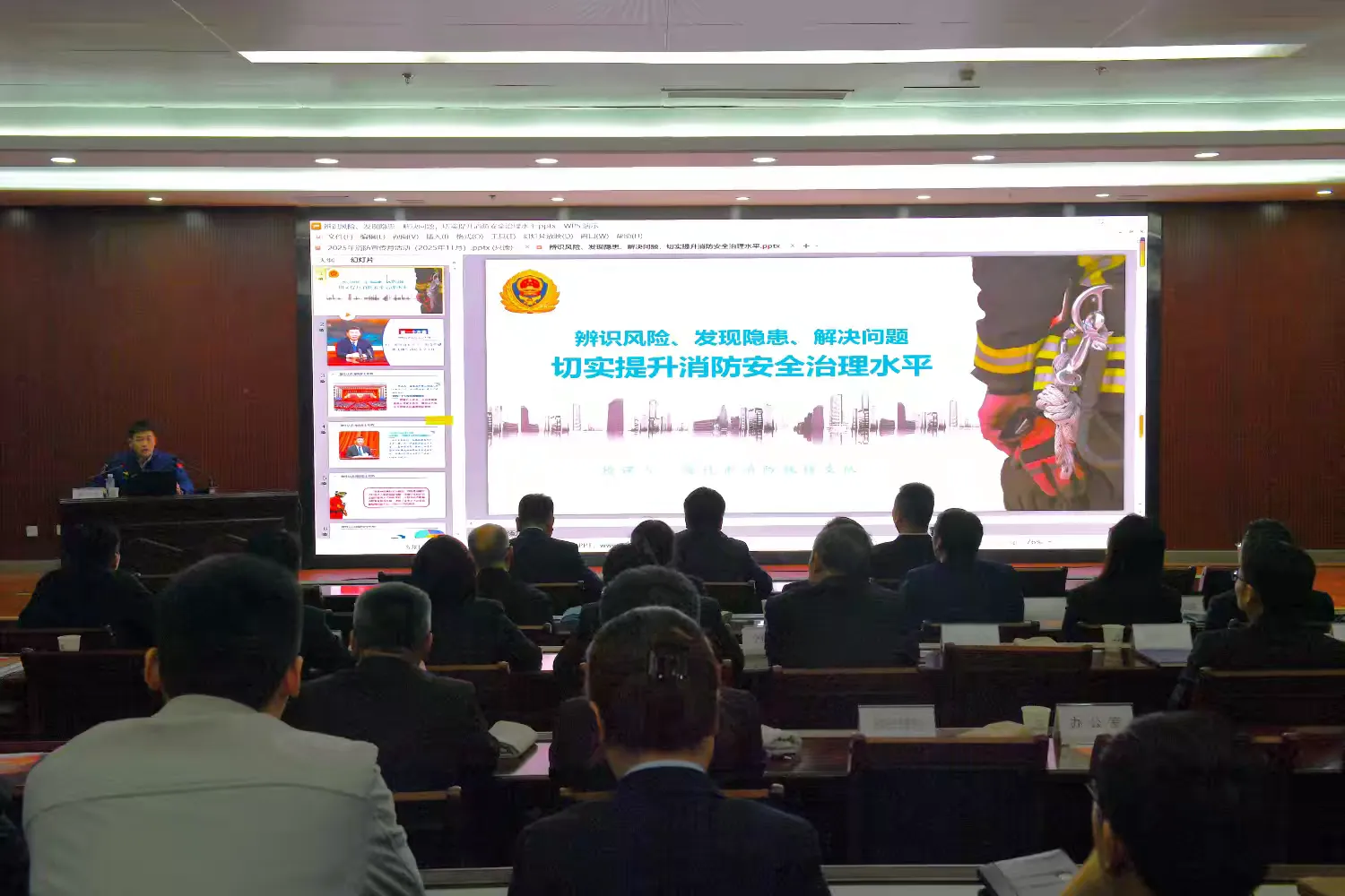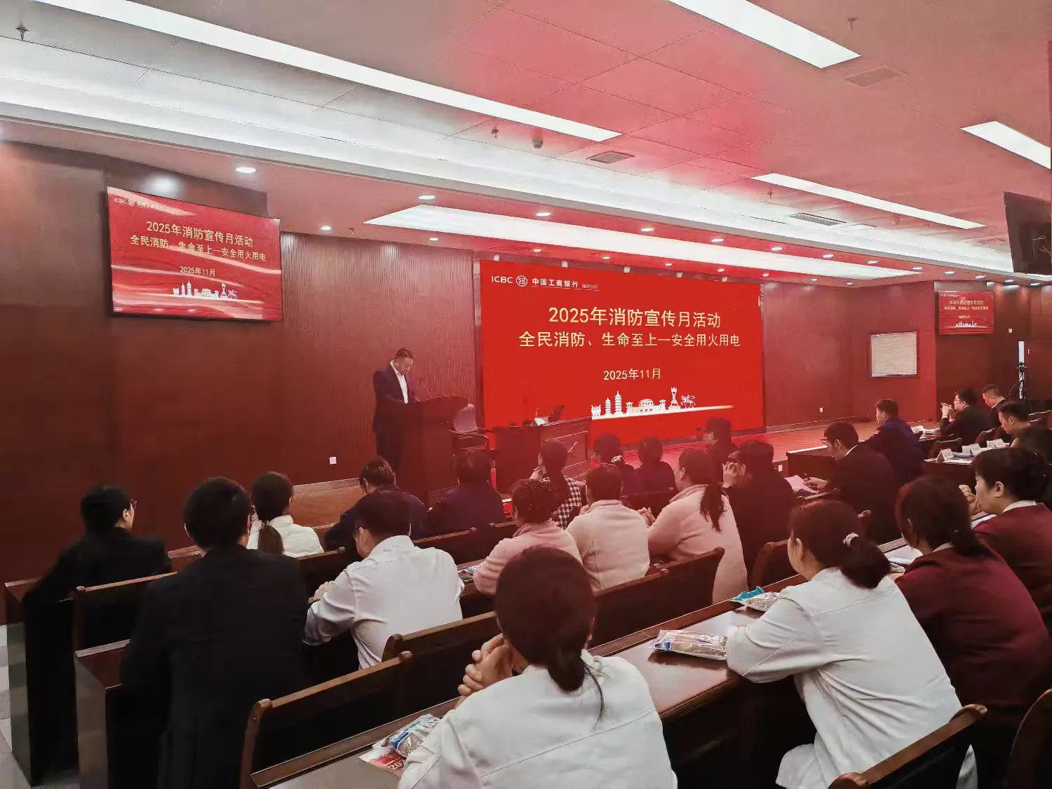 中国江苏网11月16日宿迁讯 今年11月9日是第34个全国消防日,11月14日,工行宿迁分行开展了以“全民消防、生命至上——安用火用电”为主题的消防安全培训及应急演练,活动邀请了市消防支队谭凌霄队长作专题授课及演练,宿迁分行党委书记蔡红兵、高级经理李奎、高级经理李宏联及城区支行和部室负责人、安全员等共同参与。旨在提升全体员工的消防安全意识和应急处置能力。