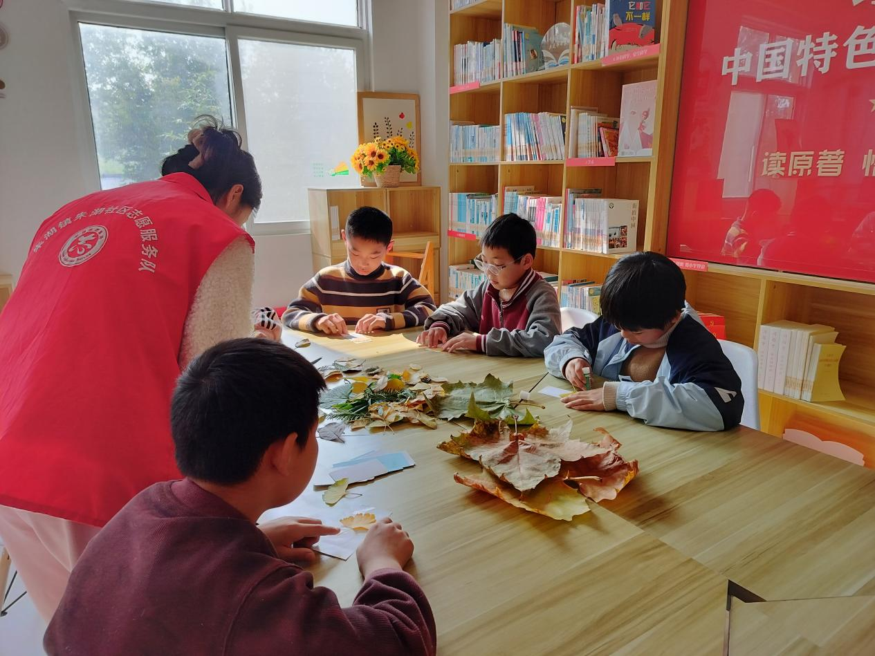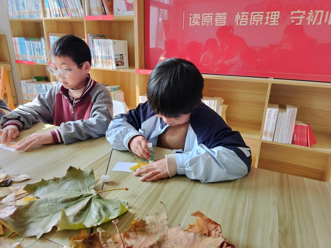 农家书屋的长桌上铺满了金黄的银杏叶、宽大的梧桐叶,宛如一片五彩斑斓的秋叶海洋。孩子们的眼睛里闪烁着好奇与兴奋的光芒,他们从众多秋叶中挑选出心仪的叶片。裁剪、穿线、拼贴、绘制可爱的图案……一片片普通的落叶在他们的小手中逐渐变身,成为一枚枚精美的“绿书签”。